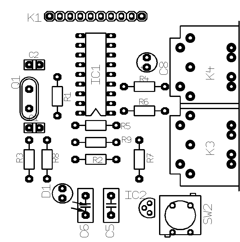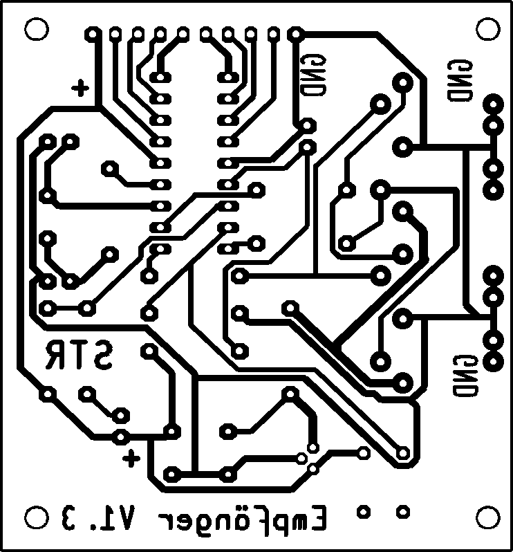 auf die anderen Platinen gesteckt werden kann, dazu muss die Stiftleiste K1 unter die Platine gelötet werden. In den Ecken erkennt man die Löcher für die Verbindungsschrauben M3.