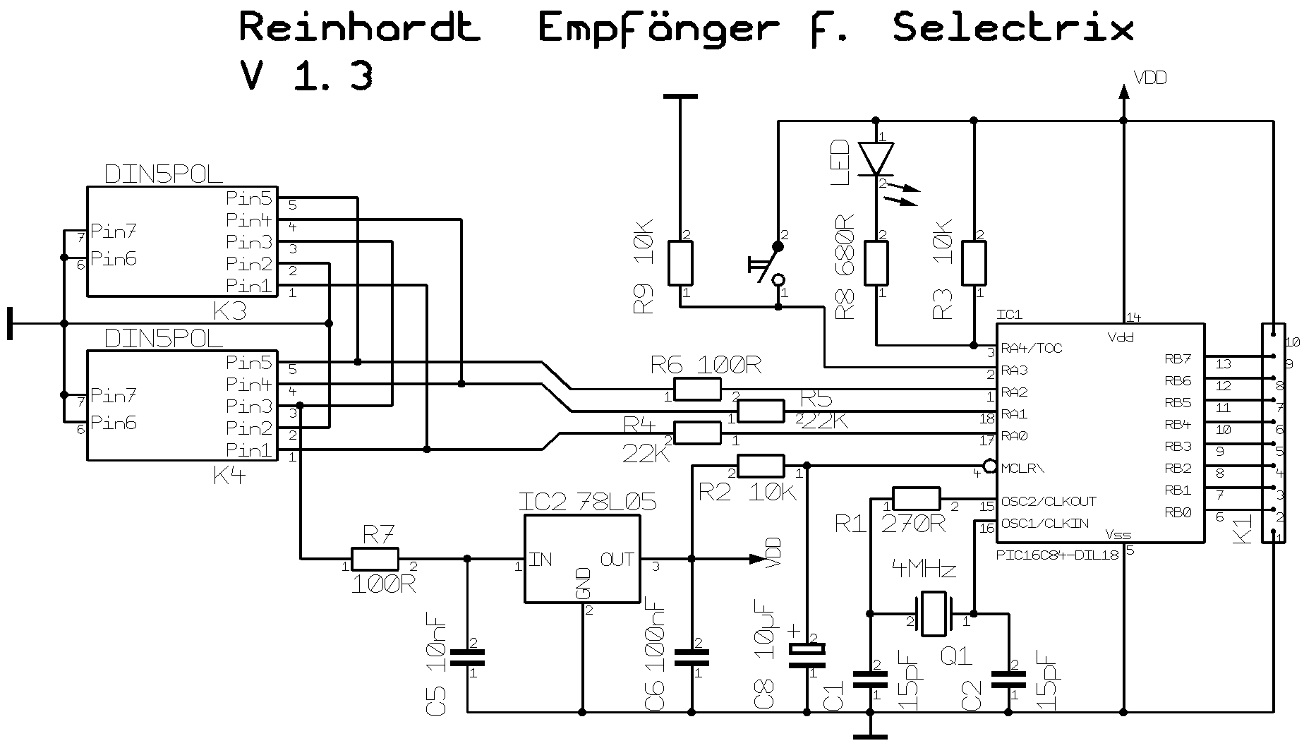 Aufgebaut ist das Ganze mit einem PIC 16F84. Meine Wahl fiel auf diesen PIC, weil er ein eingebautes EPROM hat und dank des Flash-PROMs in der Entwicklungsfase sehr einfach zu handhaben ist.