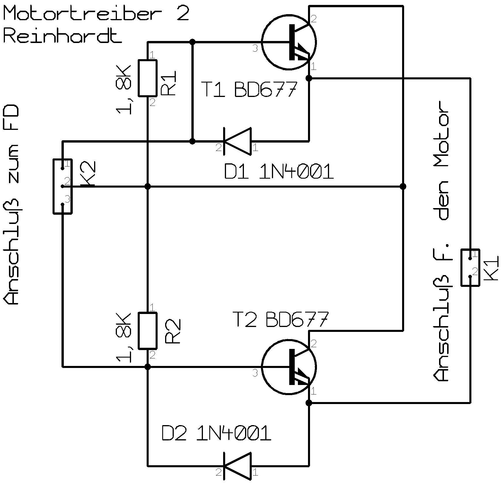 Da meine Funktionsdecoder FD1 und FD2 nicht für Motorantriebe geeignet sind habe ich einen Schaltungsvorschlag, den es mal auf der Seite von Heiko Deserno gab, aufgegriffen und dafür eine kleine Zusatzplatine zu den Decodern angefertigt.